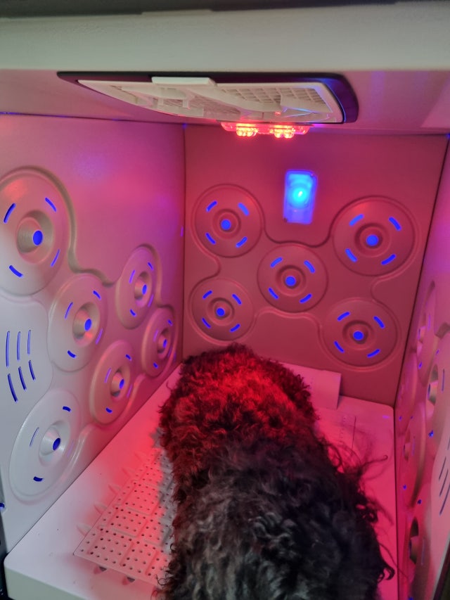 생각보다 강아지가 잘 적응해주고있어요 완전 겁쟁이라 문 닫으면 계속 긁고 짖어서 문열고 말려요 그래도 3단계로하면 바람 세서 금방 다 말라요. 3.5kg 등길이 30좀 안되는데 대각선으로 엎드릴 수 있고 일어나도 자리 넉넉해요 더큰거샀으면 보관하기 힘들뻔